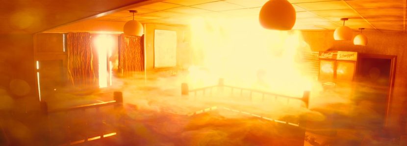 Another signature sequence took place inside an abandoned Happy Eater restaurant. Here, the characters confront a toxic gas miasma that explodes when ignited. With minimal photographic reference, Union’s CG team developed the look almost from scratch. The gas needed to be thin, oily, and visually layered, believable enough to sell the danger but also cinematic in its presence. Achieving this required extensive FX simulations with nuanced lighting, careful cut-to-cut continuity, and rotoanimation so that the drifting gas realistically interacted with actors’ movements.