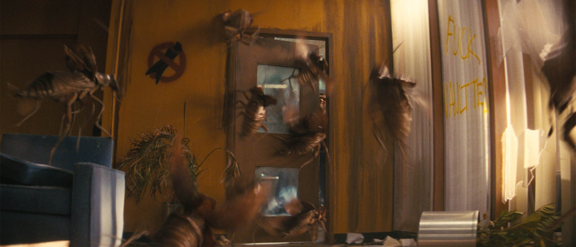 On set, actors sometimes performed against simplified dummy roach stand-ins, giving them something physical to react to. The props were stripped of wings and antennae so performers could safely handle them, but the visual effects team still had to reconcile those practical interactions with the fully animated digital creatures.